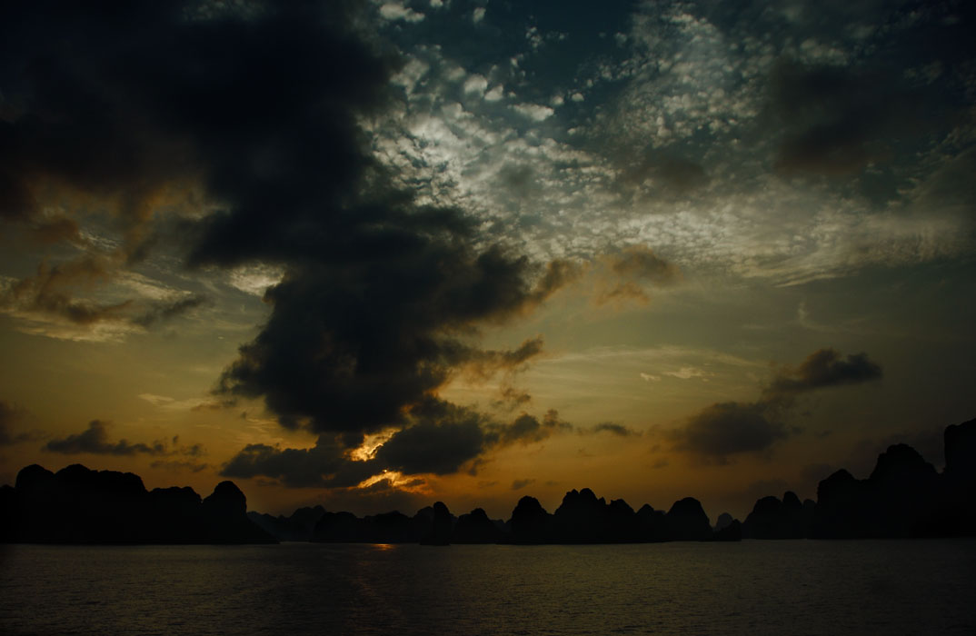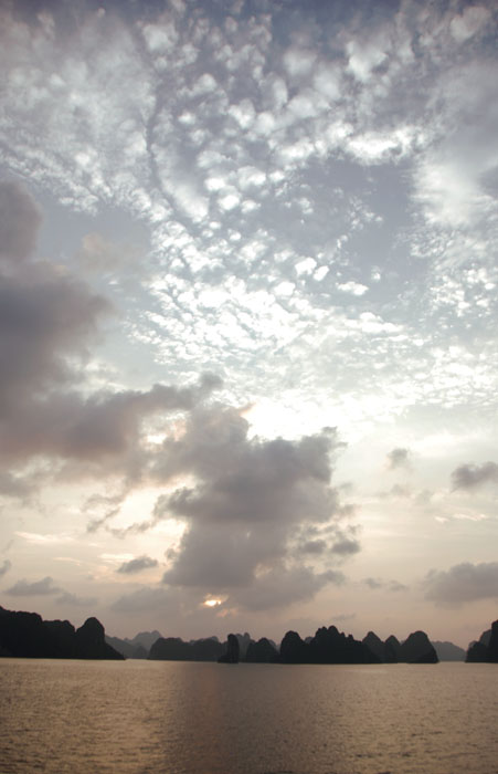Semangkin kapal menjauhi pelabuhan dan Cat Ba, semangkin suasana terasa sangat hening dan sepi. Kami berada di kepungan pulau-pulau karang. Karang-karang yang menjulang dari lautan itu seperti gigi-gigi monster. Langit berwarna biru terang dengan awan putih seperti bulu domba. Saya berdoa semoga cuaca akan tetap seperti ini sehingga kami bisa mendapatkan sunset dan sunrise, sayang begitu matahari akan tenggelam, langit berubah menjadi gelap dan awan hitam menghalangi sinar mentari.