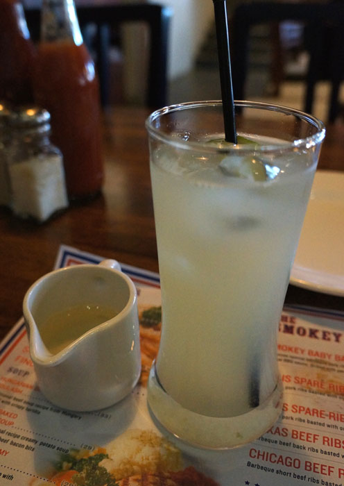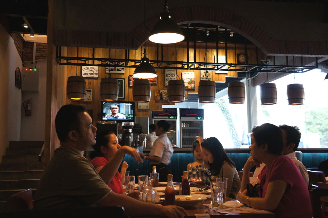 Kita duduk di sofa di pojok ruangan. Restonya keren dengan lampu remang-remang gitu yang saya sukaaa karena kesannya jadi warm dan keren tapi jadi jelek kalo buat moto makanan hahaha. Setelah order yang lumayan lama karena Matt sibuk nanyain ini itu. Yailah dia baru dari hutan jadi semua-semuanya pengen dimakan. Dari ribs sampe hamburger. Gilaaa yaa….untung dia disadarkan harganya hahahha.