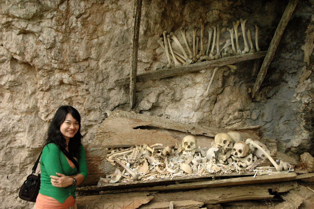 Toraja jelas bukan hanya kopi. Tempat cantik ini punya banyak cerita mistis mendebarkan hati. Sebutlah Londa, salah satu tempat peristirahatan terakhir orang Toraja yang dipenuhi cerita2 mistis nan fantastis. Saya dan beberapa temen sangking penasarannya dan hanya memiliki waktu sedikit, memasuki tempat ini tepat saat azan magrib. Kebayang suasana seram tempat yang dipenuhi tengkorak manusia dengan cerita-cerita mistisnya. Langit mulai gelap ketika kami mindik-mindik memasuki gua kecil yang didalamnya penuh tengkorak manusia. Entah sangking penasaran atau emang kegatelan pengen dapat foto, saya tetap memaksakan diri untuk masuk dan mendengarkan semua cerita 🙂