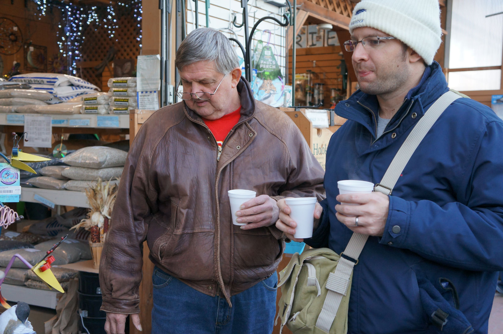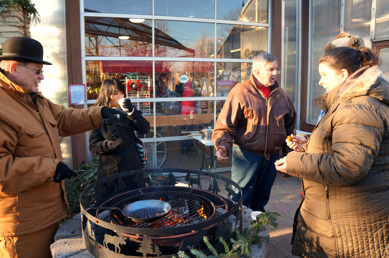 Sabtu siang suhu udara -12 C, dinginnya amit-amit. Bahkan yang bule disini aja bilang emang dingin banget. Begitu nyampe tempatnya langsung disambut si bapak yang diatas itu dan beberapa temen bapaknya si Matt yang ternyata udah nungguin disana. Mereka ngobrol-ngobrol sambil manggang kacang chestnut dan minum brandy (gratis haha). Di dalam toko ada juga minuman enak banget yang rasanya kayak apel sama jahe dijadiin satu. Saya minum semuanya dong kan udah dibilang gak mau rugi haha.