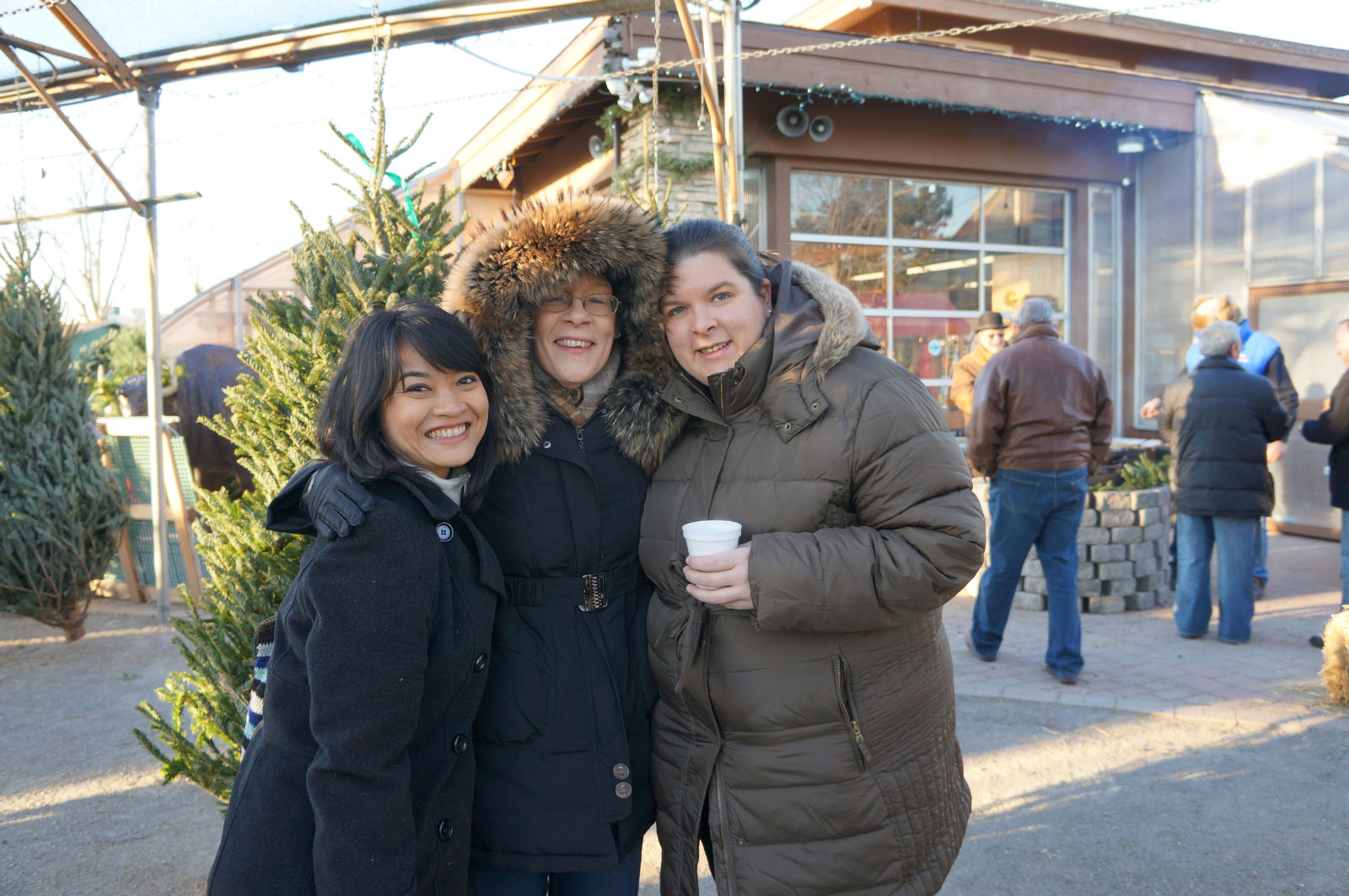 Pohon natal yang dijual posisinya digantung-gantung gitu di luar tapi ketutup ya. Begitu masuk disini bau pohon pinus (setiap ngomong pinus tree, yang cowok-cowok langsung ketawa…..ihhhh) bakalan berasa banget. Seger dan wangi gitu. Kalo yang suka masuk hutan pasti berasa gak asing deh. Saya seneng berdiri diantara pohon-pohon yang digantung itu tapi gak suka sama anginnya yang dingin banget. Jadi orang-orang juga kalo gak didalam toko (minum-minum dan makan kue-kue) yah nongkrong di deket panggangan kacang sambil gosip-gosip kayak bapaknya si Matt.