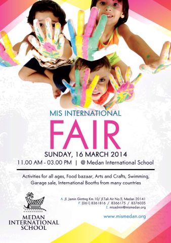 Ok, jadi tanggal 16 Maret 2014 ini buat yang tinggal di Medan trus bingung mau ngapain (anak radio banget pas bacain adlib) coba ya main ke Medan International School (MIS) . Buat yang ngikutin IG saya @nyonyasepatu mungkin beberapa kali pernah liat saya posting acara-acara di sekolahan. Setiap acara selalu fun dan bikin happy. Penasaran kan ya pengen tau juga π nah datang aja tgl 16 maret ini bawa temen, sodara, pacar, anak atau siapa ajalah buat main-main ke MIS karena ada acara MIS INTERNATIONAL FAIR.