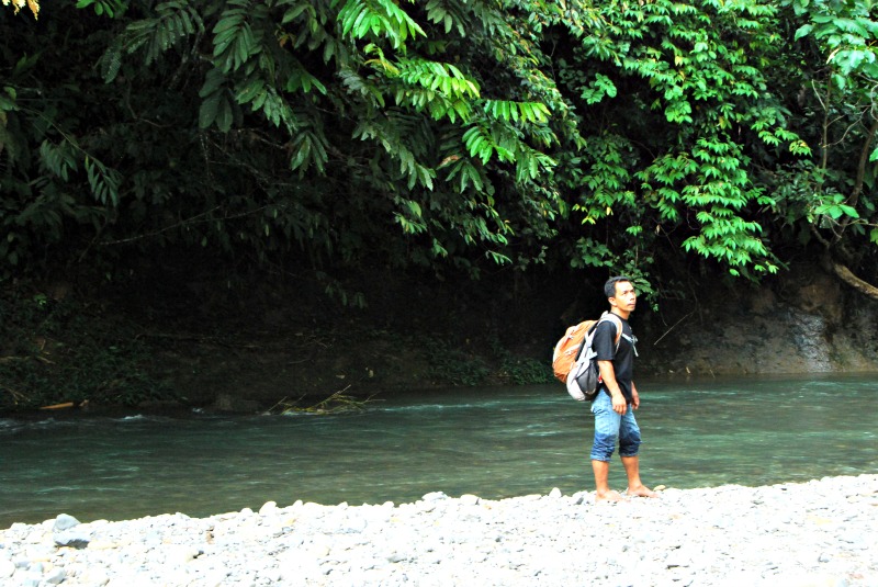 Berpegangan tangan saya dan bang Nuar menyebrangi sungai kecil ini. Setelah itu saya segera nyemplung. Airnya dingin segar. Rasanya enak sekali. Setelah 15 menit didalam air, saya duduk diam di pinggir sungai yang dipenuhi batu-batu kecil dan kaget karena ditempat sesepi itu ada beberapa kali bapak-bapak yang lewat di sungai sambil membawa bambu. Saya kurang tau persis apakah bambu ilegal diambil dari taman nasional/hutan lindung kayak gitu.
