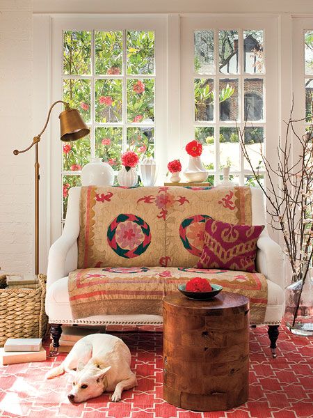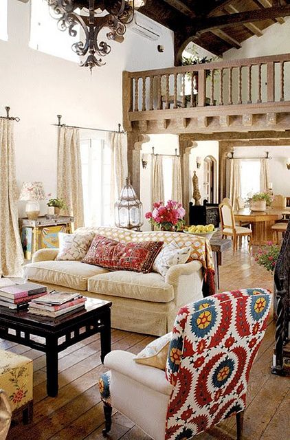 9. Eclectic clean boho; lantai kayu, dinding tadelakt (dikapur a la rumah Maroko), langit-langit tinggi, 1 sofa besar untuk 4 orang, jendela besar pemandangan ke taman, danau atau pantai, clean look dengan detail etnik barang dari Indonesia dan souvenir liburan.