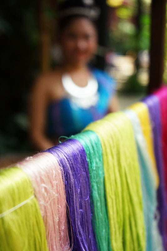 Dari pintu gerbang museum kita langsung menemukan restoran dan loket tiket dari kayu. Ada seorang gadis cantik yang mendemokan cara menenun sutera. Saya lihat ada beberapa anak kecil yang tertarik dan ikutan berfoto dengan gadis tersebut. Oya kita juga bisa loh minta gadis penenun itu untuk pose 🙂