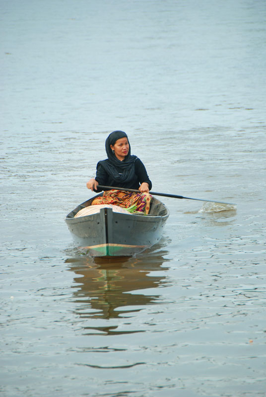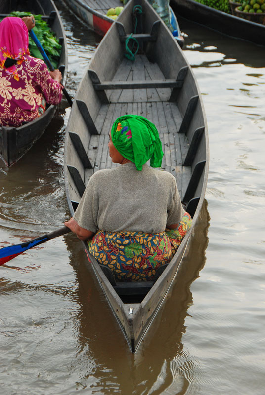 Rata-rata ibu-ibu yang berjualan mendayung kapal kecilnya sendirian atau membawa anaknya. Kapal akan bergoyang-goyang dan mereka masih santai ngobrol-ngobrol dengan sesama temannya. Sesekali berteriak untuk menjajakan dagangannya.