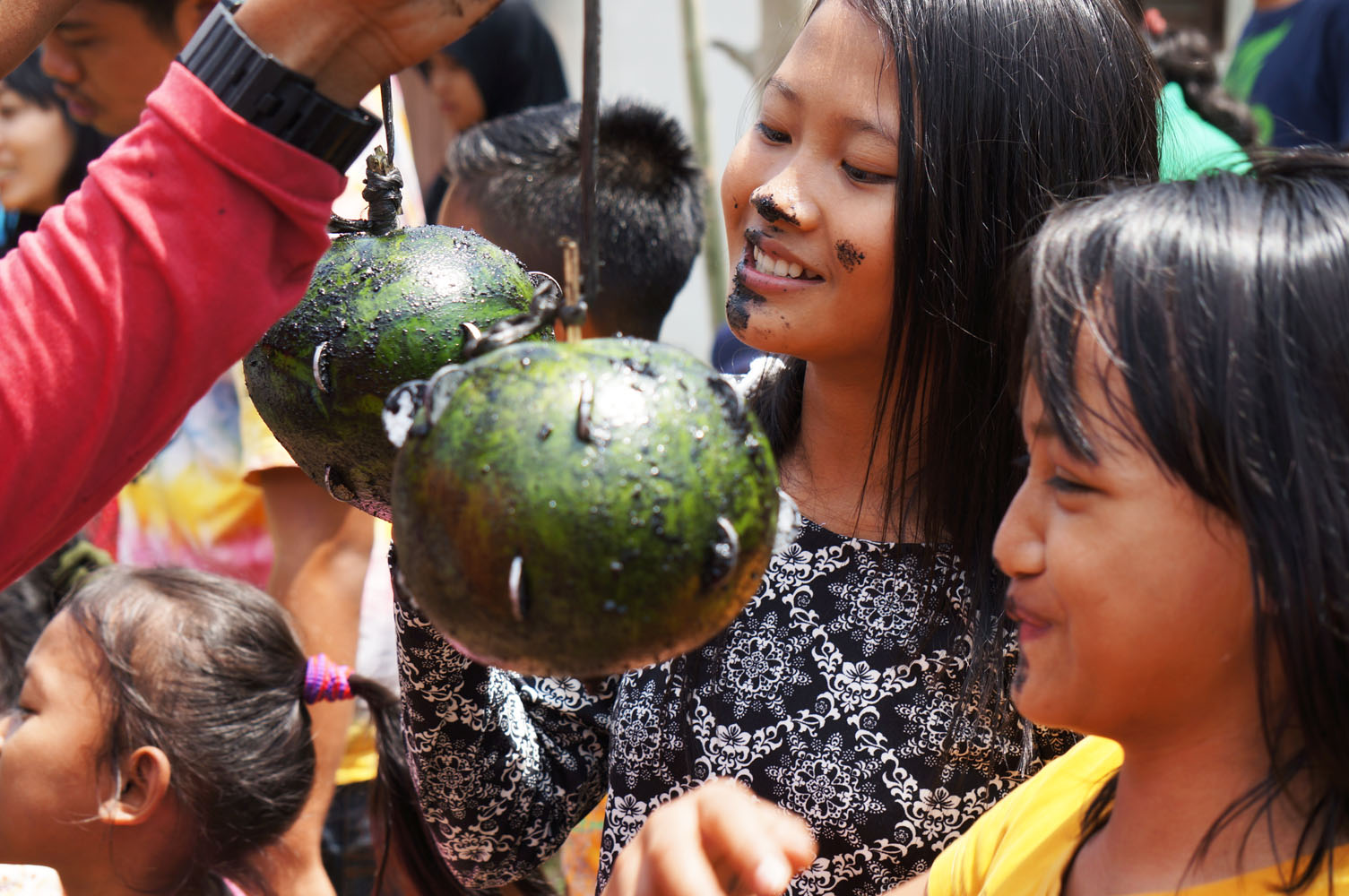 Itu duit ya, yg ditancep kesemangka…? Waduuuh bahaya ya…kalo ketelen ama anak anak ini, kayaknya lebih baik kerupuk atau sesuatu yg bisa dimakan..