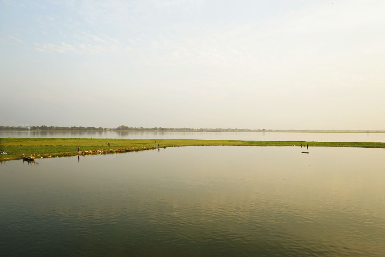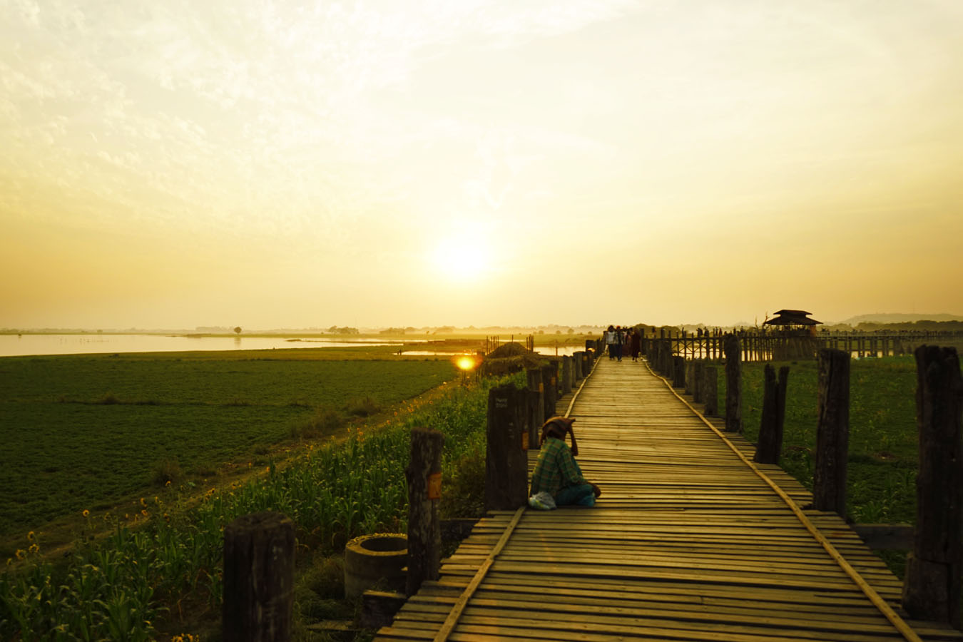 Karena terbuat dari kayu, jika kita jalan diatasnya maka akan terasa sedikit goyang-goyang. Loni, sahabat saya karena takut hanya nungguin saya jalan sampai keujungnya. Untungnya ketemu temen lain sehingga saya ditemenin dia sampai keujung jembatan. Menariknya dipinggir danau ternyata banyak ladang bunga dan jagung. Termasuk bunga matahari. Sayangnya karena saya sebenarnya lumayan takut juga jalan diatas jembatan kayu yang goyang-goyang semua niat buat ngambil foto buyar haha. Kami lebih sering duduk sambil ngeliatin warga lokal hilir mudik dan ketika matahari terbenam saya mencoba mengambil beberapa foto. Percayalah pemandangan yang saya lihat dengan mata saya kemaren jauhhhhh lebih bagus 🙂