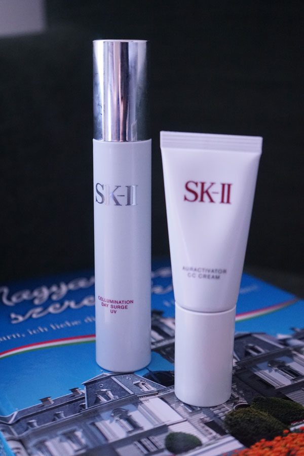 Kebetulan karena saya sudah menggunakan SK-II Facial Treatment Essence dari SK-II jadi kepikiran untuk menggunakan produk yang sama aja. Saya pilih menggunakan SK-II CC Cream Auractivator yang memang sudah mengandung SPF 50 PA++++ dan pelembab dari SK-II Cellumination Day Surge UV yang mengandung SPF 30 PA++++.